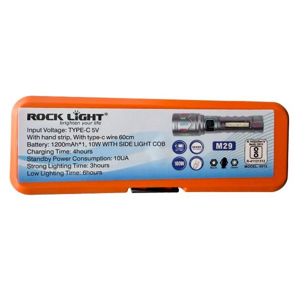 Rock Light M29 Zooming LED Metal Torch Light has installed a stable 2 to 3 hours backup because it is based on the use of a PO4 lithium battery, so you will never be looking for a plug to recharge. 7 LIGHT MODES: Low, High, Blinker, Top Light, SOS, SOS Blinker and Zoomable. You can drop it outside or inside, depending on the job