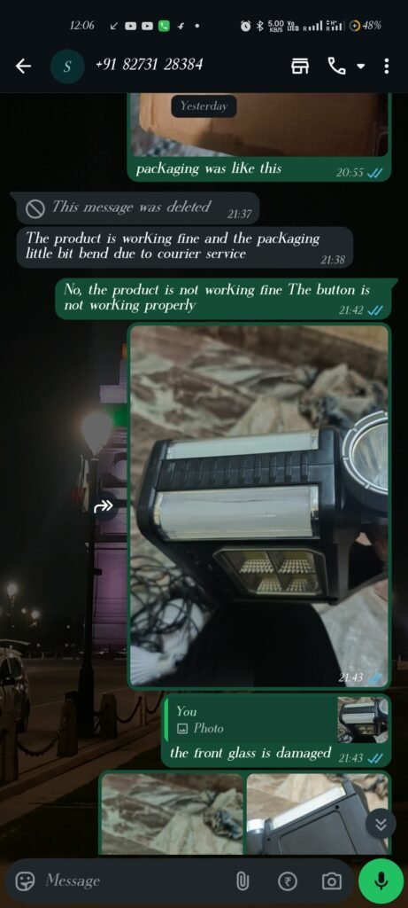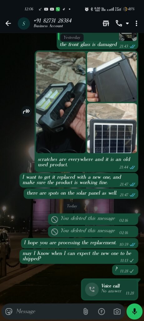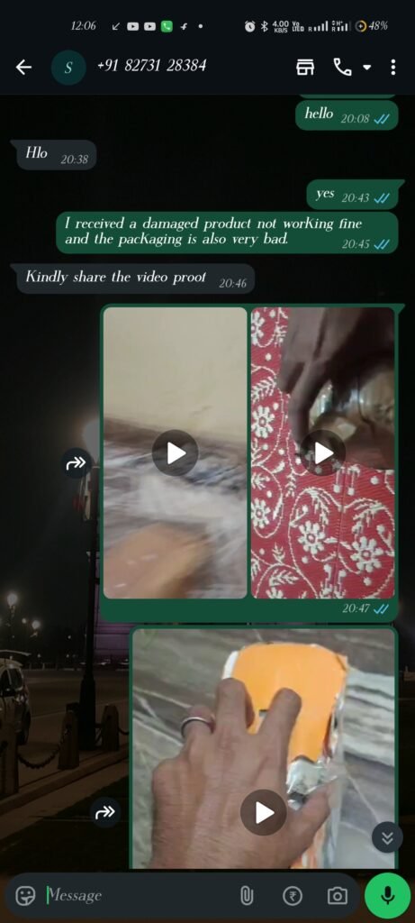 I received damaged product and it is also used. I have shared the proof as well but instead of providing replacement or refund, simply blocked me on WhatsApp and the contact number is also not reachable.